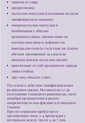 Миофасциален масаж (MFR) Това е техника на масаж, спадаща към мануалната терапия за разтягане. Основната й цел е отпускането на фасцията и тъканите между нея, костите и мускулите, включително дермата. Това се постига чрез манипулация на т.нар. спусъкови точки на болката, наричани още "ключови точки". Техниката включва продължително пресиране на точките и разтягане на фасцията и тъканите. Фасцията се намира между мускули и кости и между мускули и дерма (група покривни тъкани вкл. кожата). Тя представлява мрежа от свързващи тъкани, които свързват мускули, органи и кости. През нея минават кръвоносни съдове, нерви и лимфни канали. Мускулите и фасцията създават обща структура - миофасция. Ако в определена част на фасцията настъпят временни проблеми, които ограничават пропускливостта и тонуса й, това може да предизвика промени в други части на фасцията в близки зони на тялото, подобно на дърпане на нишка в паяжина. Такива изменения на фасцията настъпват най-често след: